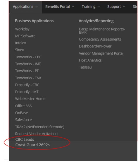 CBC Leads and USCG 2692s are now under the Applications drop-down on the